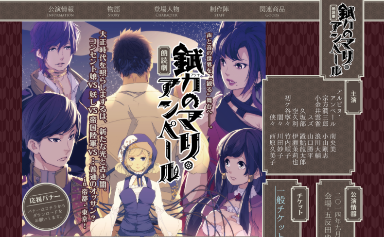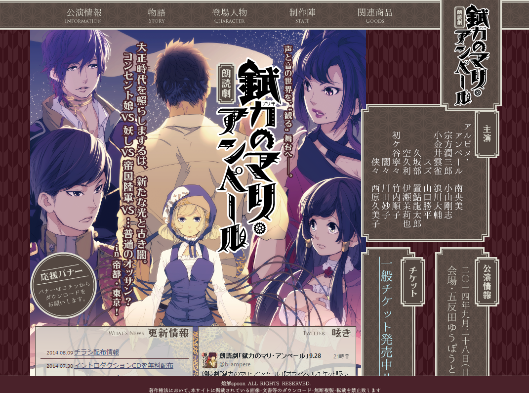 朗読劇「錻力のマリ・アンペール」 DATE 2014.08.12 CATEGORYウェブサイト制作TAGCGI設置 / コーディング / サイトデザイン 2014.07 新規制作 http://meltyspoon.net/ampere/